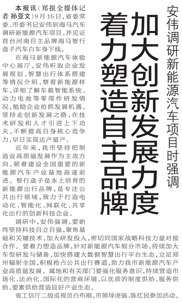 9月15日,省委常委、市委书记安伟到海马汽车调研新能源汽车项目,并见证首台河南自主品牌海马智行盒子汽车白车身下线。(今日《郑州日报》1版)