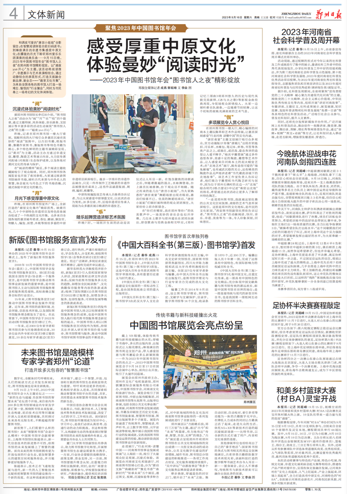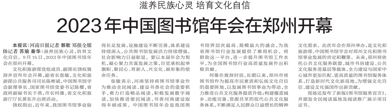 滋养民族心灵,培育文化自信。9月15日,2023年中国图书馆年会在郑州开幕。(今日《郑州日报》1版)