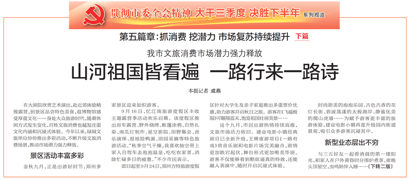 在大剧院欣赏艺术演出,赴近郊体验精致露营,到景区品尝特色美食,逛博物馆感受厚重文化……身处大众旅游时代,随着休闲方式发生变化,百姓文旅消费也越发注重文化内涵和沉浸式体验。今年以来,绿城文旅单位纷纷推出多彩活动,不断升级文旅消费场景,推动市场潜力强力释放。(今日《郑州日报》1版、2版)