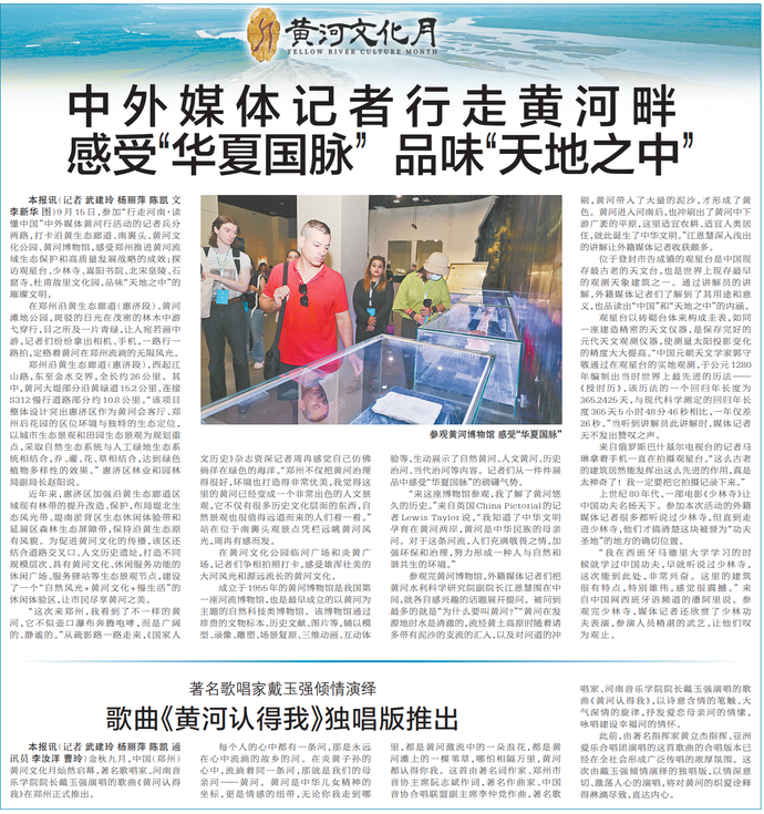 金秋九月,中国(郑州)黄河文化月灿然启幕,著名歌唱家、河南音乐学院院长戴玉强演唱的歌曲《黄河认得我》在郑州正式推出。(今日《郑州日报》2版)