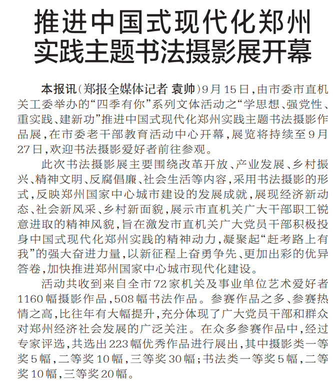 9月15日,由市委市直机关工委举办的“四季有你”系列文体活动之“学思想、强党性、重实践、建新功”推进中国式现代化郑州实践主题书法摄影作品展,在市委老干部教育活动中心开幕,展览将持续至9月27日,欢迎书法摄影爱好者前往参观。(今日《郑州日报》2版)