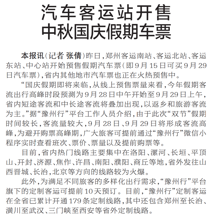 昨日,郑州客运南站、客运北站、客运东站、中心站开始预售假期汽车票(即9月15日可买9月29日汽车票),省内其他地市汽车票也正在火热预售中。(今日《郑州日报》2版)