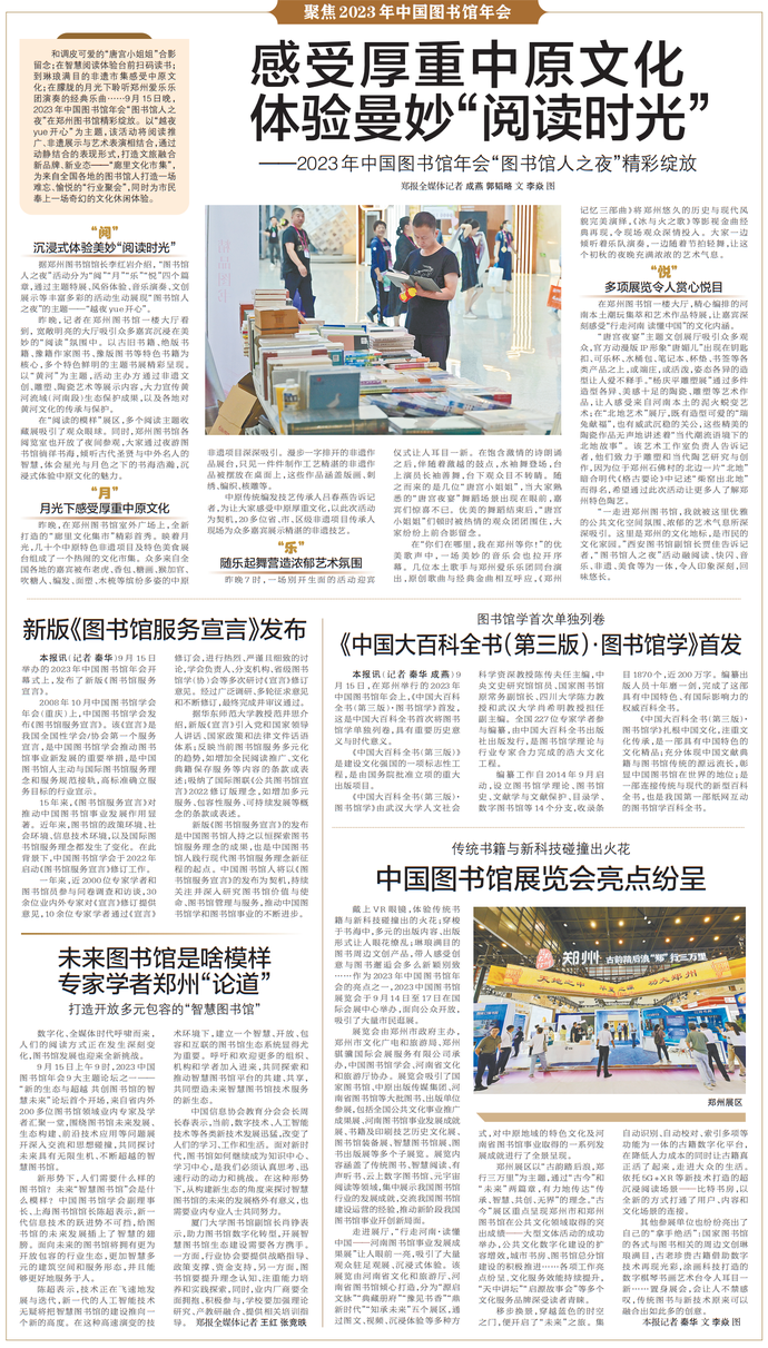 9月15日举办的2023年中国图书馆年会开幕式上,发布了新版《图书馆服务宣言》。(今日《郑州日报》4版)