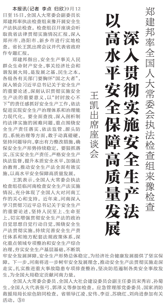 9月12日至15日,全国人大常委会副委员长郑建邦率执法检查组来豫开展安全生产法执法检查。检查组召开座谈会听取我省法律贯彻实施情况汇报,深入郑州市、洛阳市、新乡市进行实地检查。省长王凯出席会议并代表省政府作专题汇报。(今日《河南日报》1版)