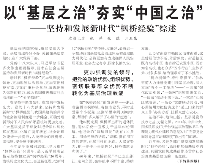 新时代“枫桥经验”更加强调党的领导、更加彰显法治思维、更加突出科技支撑、更加注重社会参与,展现出历久弥新的魅力,成为我国推进基层社会治理的一个“金字招牌”。