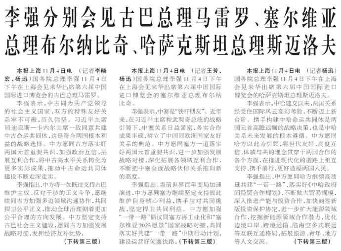 国务院总理李强11月4日下午在上海会见来华出席第六届中国国际进口博览会的古巴总理马雷罗。(今日《人民日报》1版、3版)