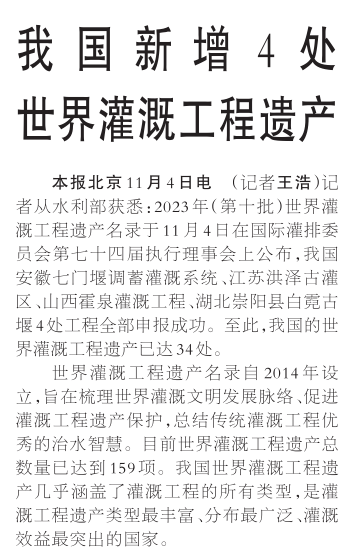 记者从水利部获悉:2023年(第十批)世界灌溉工程遗产名录于11月4日在国际灌排委员会第七十四届执行理事会上公布,我国安徽七门堰调蓄灌溉系统、江苏洪泽古灌区、山西霍泉灌溉工程、湖北崇阳县白霓古堰4处工程全部申报成功。至此,我国的世界灌溉工程遗产已达34处。(今日《人民日报》1版)