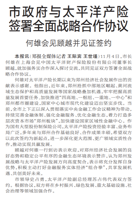 11月4日,市长何雄在上海会见中国太平洋财产保险股份有限公司董事长顾越,就加强务实合作深入探讨交流,共同见证双方签署全面战略合作协议。(今日《郑州日报》1版)