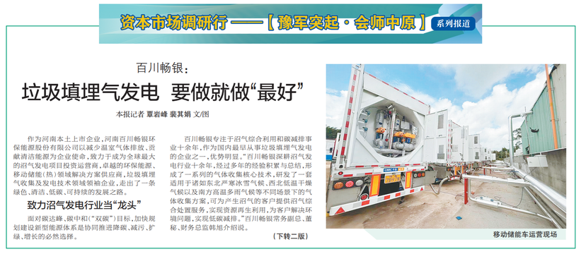 作为河南本土上市企业,河南百川畅银环保能源股份有限公司以减少温室气体排放、贡献清洁能源为企业使命,致力于成为全球最大的沼气发电项目投资运营商,卓越的环保能源、移动储能(热)领域解决方案供应商,垃圾填埋气收集及发电技术领域领袖企业,走出了一条绿色、清洁、低碳、可持续的发展之路。(今日《郑州日报》1版、2版)