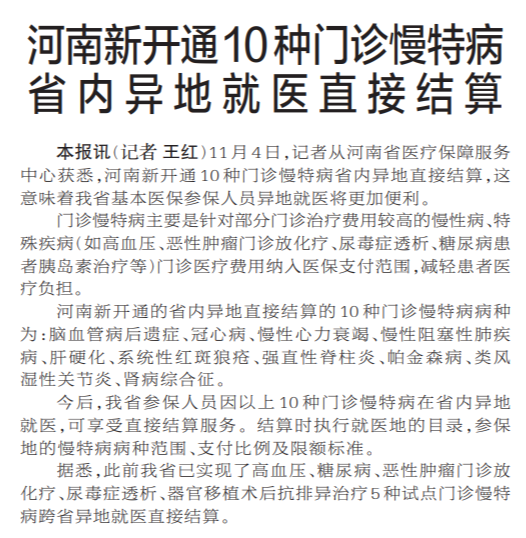 11月4日,记者从河南省医疗保障服务中心获悉,河南新开通10种门诊慢特病省内异地直接结算,这意味着我省基本医保参保人员异地就医将更加便利。(今日《郑州日报》1版)