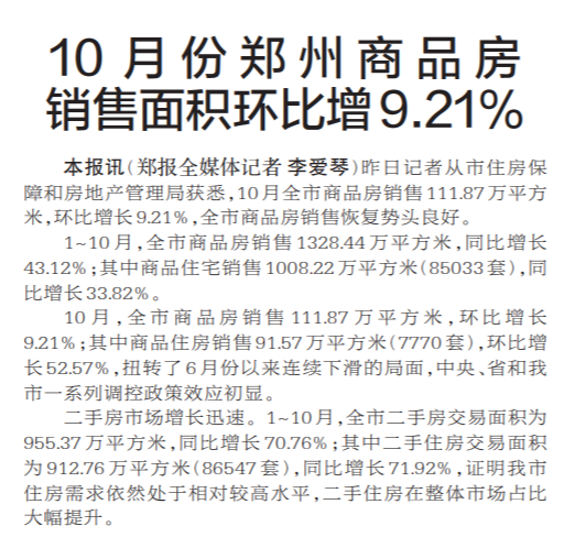 昨日记者从市住房保障和房地产管理局获悉,10月全市商品房销售111.87万平方米,环比增长9.21%,全市商品房销售恢复势头良好。(今日《郑州日报》2版)