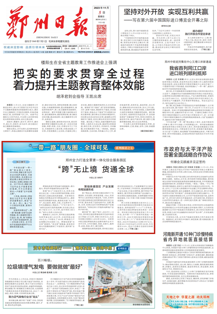 本报特别推出【“一带一路”朋友圈·全球可见】系列报道,深入报道郑州着力打造空、陆、网、海“四路协同”立体开放通道体系,进一步构建立体化、全方位的开放通道和载体平台支撑体系的新实践。