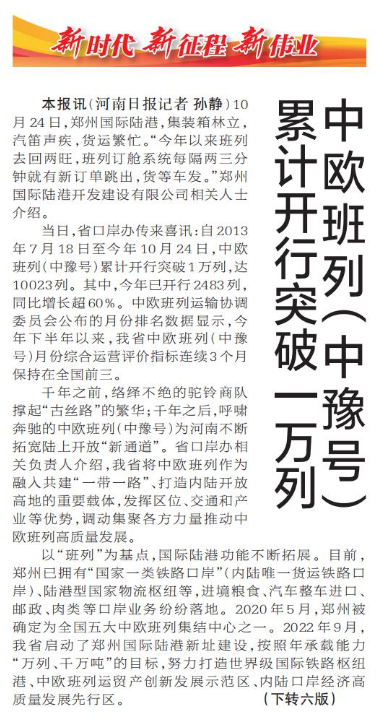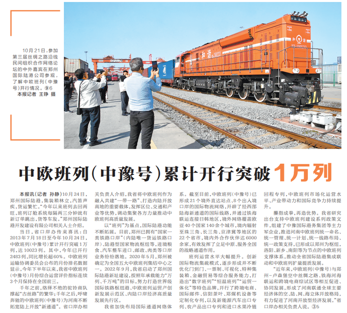 当日,省口岸办传来喜讯:自2013年7月18日至今年10月24日,中欧班列(中豫号)累计开行突破1万列,达10023列。其中,今年已开行2483列,同比增长超60%。中欧班列运输协调委员会公布的月份排名数据显示,今年下半年以来,我省中欧班列(中豫号)月份综合运营评价指标连续3个月保持在全国前三。(今日《河南日报》1版)