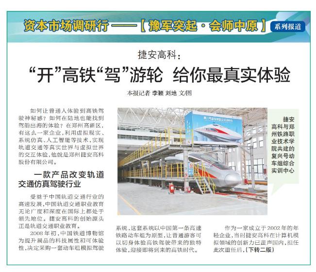 如何让普通人体验到高铁驾驶神秘感?如何在陆地也能找到驾船出海的体验?在郑州高新区,有这么一家企业,利用虚拟现实、系统仿真、人工智能等技术,实现轨道交通等真实世界与虚拟世界的交互体验,他就是郑州捷安高科股份有限公司。(今日《郑州日报》1版、2版)