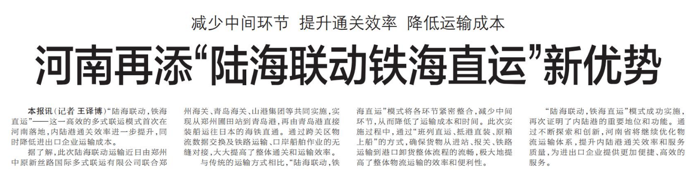“陆海联动,铁海直运”——这一高效的多式联运模式首次在河南落地,内陆港通关效率进一步提升,同时降低进出口企业运输成本。(今日《郑州日报》2版)