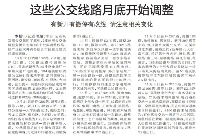 昨日,记者从郑州公交集团了解到,《郑州市公交线网服务提升方案》第十批拟调整线路,经广泛征求并充分结合市民意见建议后即将调整。(今日《郑州日报》2版)