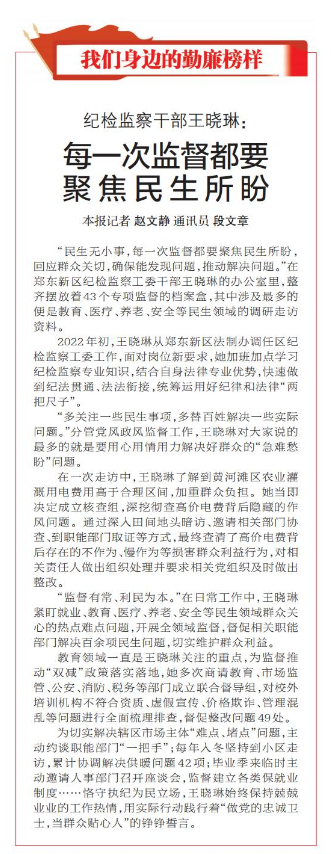 “民生无小事,每一次监督都要聚焦民生所盼,回应群众关切,确保能发现问题,推动解决问题。”在郑东新区纪检监察工委干部王晓琳的办公室里,整齐摆放着43个专项监督的档案盒,其中涉及最多的便是教育、医疗、养老、安全等民生领域的调研走访资料。(今日《郑州日报》2版)
