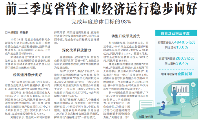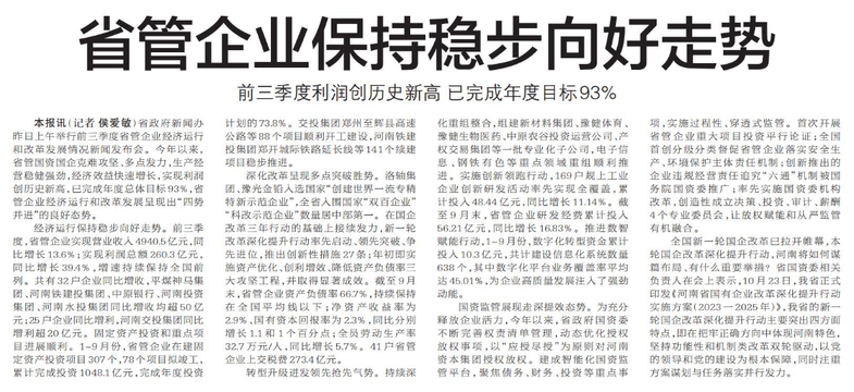 10月24日,记者从省政府新闻办新闻发布会上获悉,2023年前三季度省管企业生产经营稳健强劲,经济效益快速增长,实现利润创历史新高,已完成年度总体目标的93%。(今日《河南日报》2版)