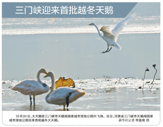 10月24日,大天鹅在三门峡市天鹅湖国家城市湿地公园内飞翔。近日,河南省三门峡市天鹅湖国家城市湿地公园迎来首批越冬大天鹅。(今日《郑州日报》6版)