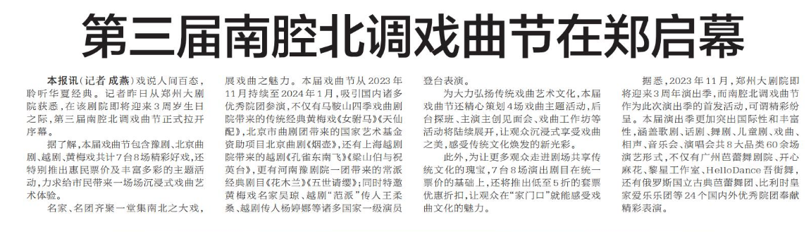 戏说人间百态,聆听华夏经典。记者昨日从郑州大剧院获悉,在该剧院即将迎来3周岁生日之际,第三届南腔北调戏曲节正式拉开序幕。(今日《郑州日报》8版)