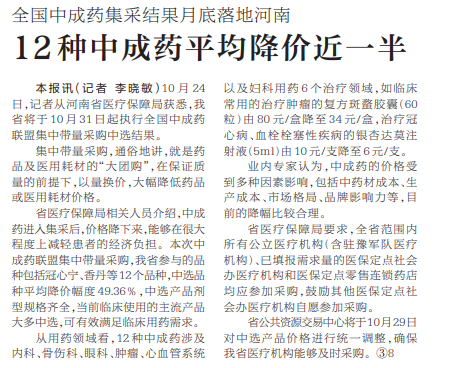 10月24日,记者从河南省医疗保障局获悉,我省将于10月31日起执行全国中成药联盟集中带量采购中选结果。(今日《河南日报》1版)