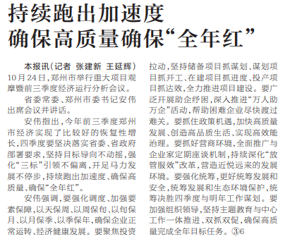 会前,安伟、何雄分别带队进行观摩。会议通报了前三季度经济运行情况,惠济区、巩义市、二七区、新郑市、经开区作发言。(今日《郑州日报》1版)