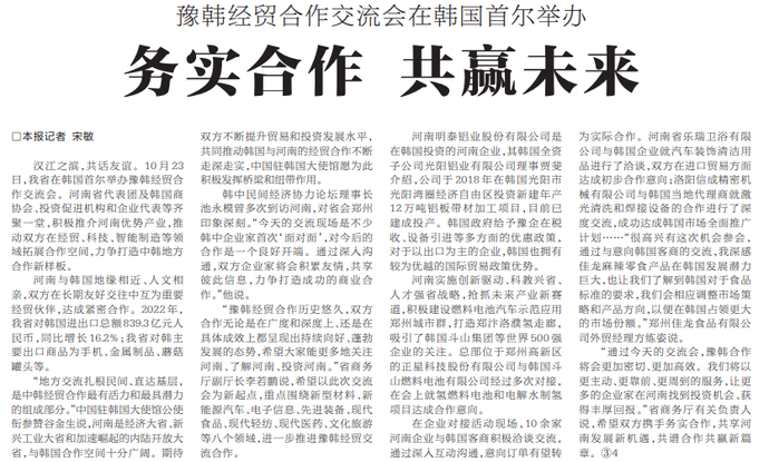 汉江之滨,共话友谊。10月23日,我省在韩国首尔举办豫韩经贸合作交流会。河南省代表团及韩国商协会、投资促进机构和企业代表等齐聚一堂,积极推介河南优势产业,推动双方在经贸、科技、智能制造等领域拓展合作空间,力争打造中韩地方合作新样板。(今日《河南日报》3版)
