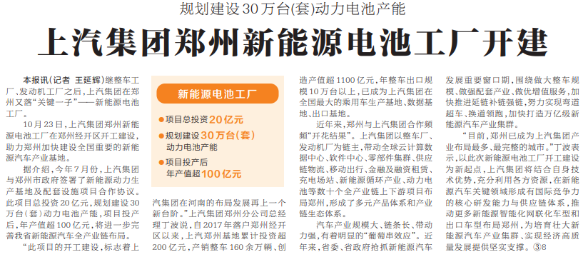 10月23日,上汽集团郑州新能源电池工厂在郑州经开区开工建设,助力郑州加快建设全国重要的新能源汽车产业基地。(今日《河南日报》3版)