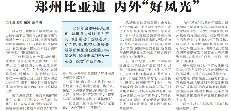 高大的工业机器人成排成列,有力的机械手灵活翻飞,炫目的焊花飞溅迸射……10月23日,记者参加郑州比亚迪超级工厂探访活动,在焊装工厂看到的是一幅宛若科幻小说中“未来工厂”的震撼画面。(今日《河南日报》3版)