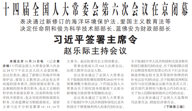 十四届全国人大常委会第六次会议24日下午在北京人民大会堂闭幕。会议经表决,通过了新修订的海洋环境保护法、爱国主义教育法;决定免去李尚福的国务委员、国防部部长职务,免去秦刚的国务委员职务,免去王志刚的科学技术部部长职务、任命阴和俊为科学技术部部长,免去刘昆的财政部部长职务、任命蓝佛安为财政部部长。国家主席习近平分别签署第12、13、14号主席令。赵乐际委员长主持闭幕会。(今日《人民日报》1版、3版)