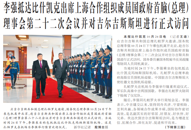 应吉尔吉斯共和国总理扎帕罗夫邀请,国务院总理李强10月24日下午乘包机离开北京,赴吉尔吉斯共和国出席上海合作组织成员国政府首脑(总理)理事会第二十二次会议并对吉尔吉斯共和国进行正式访问。国务委员兼国务院秘书长吴政隆等陪同人员同机离京。(今日《人民日报》1版、3版)