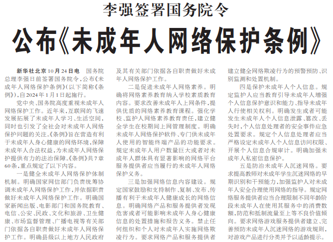 国务院总理李强日前签署国务院令,公布《未成年人网络保护条例》,自2024年1月1日起施行。(今日《人民日报》3版)