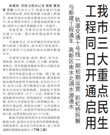 9月28日上午,轨道交通10号线一期初期运营、彩虹桥拆解与新建工程通车、高新区南水北调水源通水仪式同日举行,标志着我市民生工程建设取得重大进展,国家中心城市承载能力进一步提升。