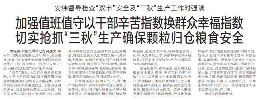 中秋节、国庆节假期临近,9月28日,省委常委、市委书记安伟到旅游景区督导检查安全生产工作,看望慰问一线值守人员,并深入田间地头检查“三秋”生产情况。