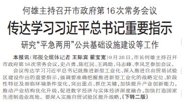 9月28日,市长何雄主持召开市政府第16次常务会议,史占勇、陈红民、王鸿勋、马志峰、李凤芝参加会议。(今日《郑州日报》1版、2版)