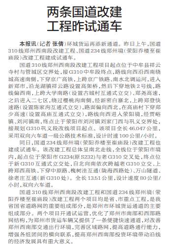 环城货运再添新通道。昨日上午,国道310线郑州西南段改建工程、国道234线郑州境(荥阳乔楼至崔庙段)改建工程建成试通车。(今日《郑州日报》2版)