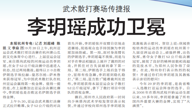 9月28日上午,杭州亚运会武术散打项目决赛在杭州萧山瓜沥文化体育中心进行。上届亚运会冠军、来自塔沟武校的河南运动员李玥瑶,在女子52公斤级决赛中迅速进入状态,经过两局激战,最终以2∶0击败伊朗选手埃拉赫-曼苏尔扬-萨米鲁米获得冠军,为中国武术散打队在杭州亚运会赢得第一枚金牌。值得一提的是,在上届雅加达亚运会决赛比赛中,李玥瑶也是击败这名伊朗选手获得金牌。(今日《郑州日报》4版)