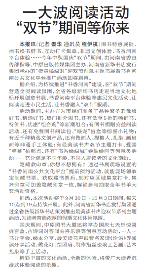 图书特惠展销、捐书换书借书、互动打卡集章、非遗文创体验、书香河南平台体验……今年中秋国庆“双节”期间,由河南省委宣传部指导、中原出版传媒集团主办、河南省新华书店发行集团承办的“橙黄橘绿时”迎双节创意主题书展暨书香河南公共文化平台推广活动即将启幕。(今日《郑州日报》4版)