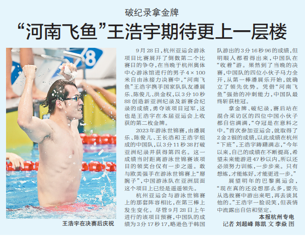 9月28日,杭州亚运会游泳项目比赛展开了倒数第二个比赛日的争夺,在当晚于杭州奥体中心游泳馆进行的男子4×100米自由泳接力决赛中,“河南飞鱼”王浩宇携手国家队队友潘展乐、陈俊儿、洪金权,以3分10秒88创造新亚洲纪录及新赛会纪录的成绩,勇夺该项目冠军,这也是王浩宇在本届亚运会上收获的第二枚金牌。(今日《郑州日报》4版)
