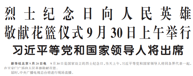 9月30日是国家设立的烈士纪念日,当天上午,习近平等党和国家领导人将同各界代表一起,在天安门广场向人民英雄敬献花篮。
