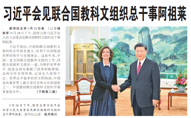 9月28日下午,国家主席习近平在人民大会堂会见联合国教科文组织总干事阿祖莱。(今日《人民日报》1版、2版)