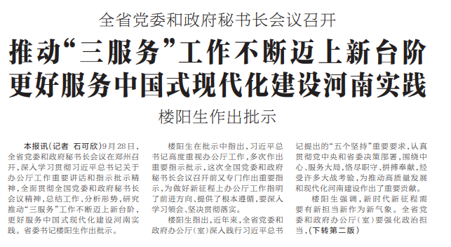 9月28日,全省党委和政府秘书长会议在郑州召开,深入学习贯彻习近平总书记关于办公厅工作重要讲话和指示批示精神,全面贯彻全国党委和政府秘书长会议精神,总结工作、分析形势,研究推动“三服务”工作不断迈上新台阶,更好服务中国式现代化建设河南实践。省委书记楼阳生作出批示。(今日《河南日报》1版、2版)