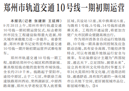 9月28日上午,郑州市举行轨道交通10号线一期初期运营仪式,标志着郑州市民生工程建设取得重大进展,特大城市承载能力进一步提升。省委常委、郑州市委书记安伟宣布轨道交通10号线一期开始初期运营并试乘电客车。(今日《河南日报》2版)