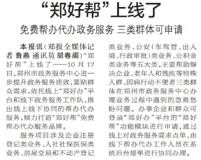 “郑好帮”上线了——10月17日,郑州市政务服务中心进一步提升政务服务质效,紧贴群众需求,依托线上“郑好办”平台和线下政务服务工作队,推出线上线下协同的帮办代办服务,倾力打造“郑好帮”免费帮办代办服务品牌。