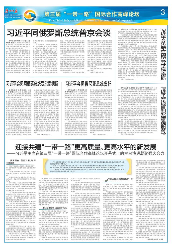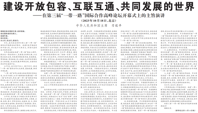 10月18日上午,国家主席习近平在人民大会堂出席第三届“一带一路”国际合作高峰论坛开幕式并发表题为《建设开放包容、互联互通、共同发展的世界》的主旨演讲。习近平宣布中国支持高质量共建“一带一路”的八项行动,强调中方愿同各方深化“一带一路”合作伙伴关系,推动共建“一带一路”进入高质量发展的新阶段,为实现世界各国的现代化作出不懈努力。(今日《人民日报》1版、3版)