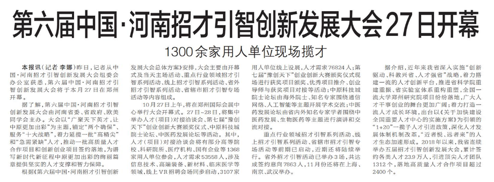 第六届中国·河南招才引智创新发展大会27日开幕