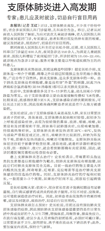 近日,支原体肺炎高发,不少孩子纷纷中招,省会多家医院儿科门诊猛增,儿科床位告急。昨日,记者从河南省人民医院了解到,为应对此次儿童就诊高峰,省人民医院儿科增设夜间延时门诊,专家建议,患者如果出现发热伴有剧烈咳嗽,建议及时就诊,规范治疗,切忌自行盲目用药。(今日《郑州日报》5版)