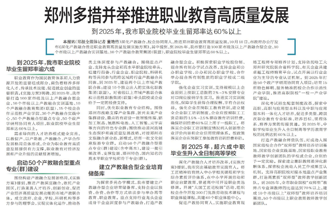 深化产教融合、校企协同育人,推进郑州职业教育高质量发展,10月18日,市政府办公厅发布《深化产教融合推进职业教育高质量发展实施方案》,其中提到,到2025年,我市要打造100家市级及以上产教融合型企业、10个市级以上产教融合实训基地、10个产教融合教育集团(联盟),职业院校毕业生留郑率达60%以上。(今日《郑州日报》5版)