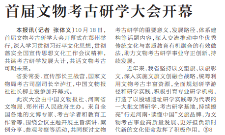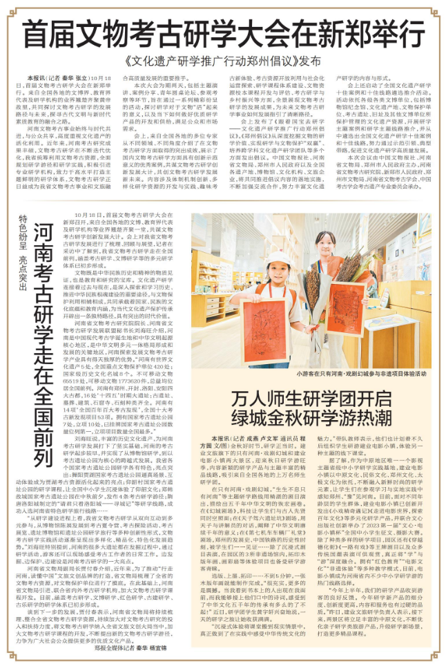 10月18日,首届文物考古研学大会开幕式在郑州举行,深入学习贯彻习近平文化思想,贯彻落实全国宣传思想文化工作会议精神,共谋考古研学发展大计,共话文物考古可期未来。(今日《河南日报》5版)