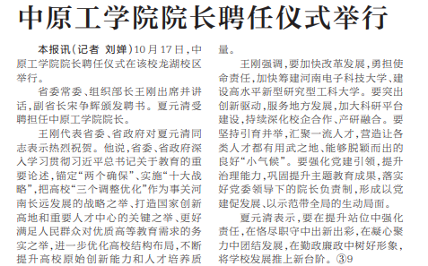 10月17日,中原工学院院长聘任仪式在该校龙湖校区举行。(今日《河南日报》5版)